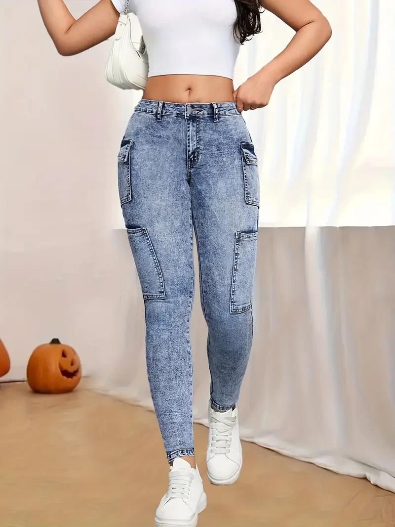 Damen Jeanshose Cargo High Waist Stretch Sexy Skinny Fit Taschen Streetwear