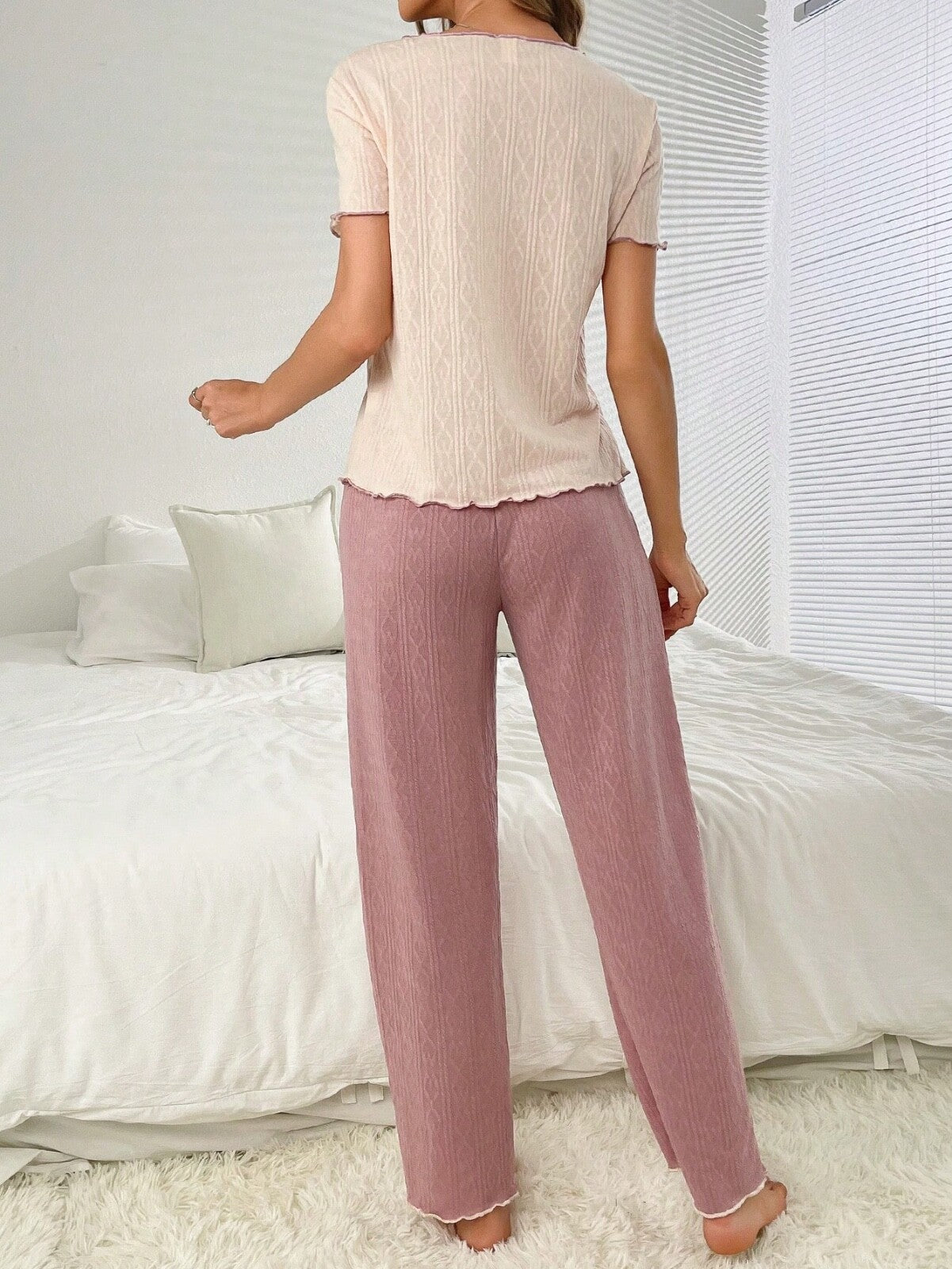 Dieser Pyjama ist nicht nur bequem – er ist ein Statement. Die Kombination aus Strukturstoff, Wellensaum und liebevollen Details macht ihn zum perfekten Begleiter für entspannte Stunden. ✨