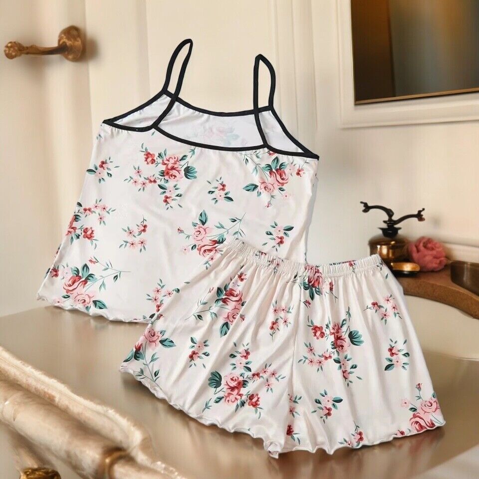 Dieser elegante zweiteilige Schlafanzug für Damen besticht durch ein zartes florales Design auf hochwertigem Satinstoff. Das Set besteht aus einem Spaghettiträger-Top mit kontrastierendem schwarzem Saum und einer passenden Shorts mit elastischem Bund. Perfekt für Frühling, Sommer oder auch gemütliche Nächte zu Hause.