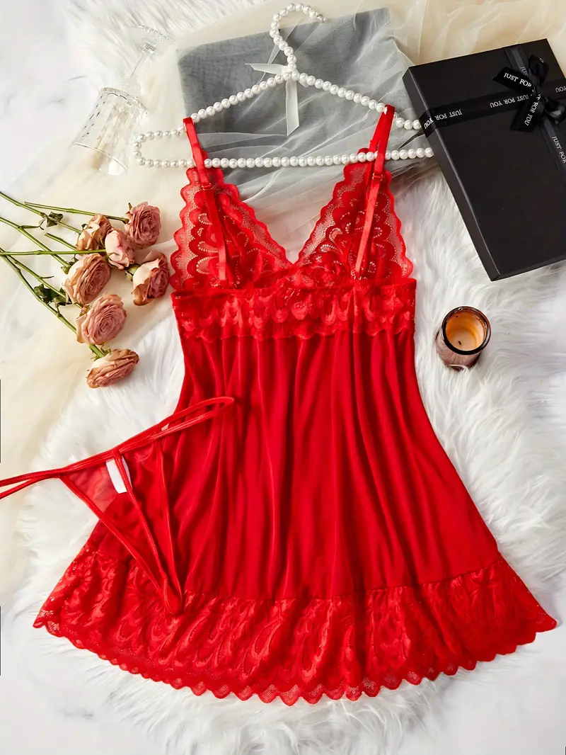 Dieses elegante Nachthemd-Set in leuchtendem Rot verleiht jeder Nacht eine besondere Note. Das zarte Spitzenoberteil sorgt für einen sinnlichen Look, während der luftige, weiche Stoff angenehm auf der Haut liegt. Inklusive passendem Tanga – für einen rundum stilvollen Auftritt.
